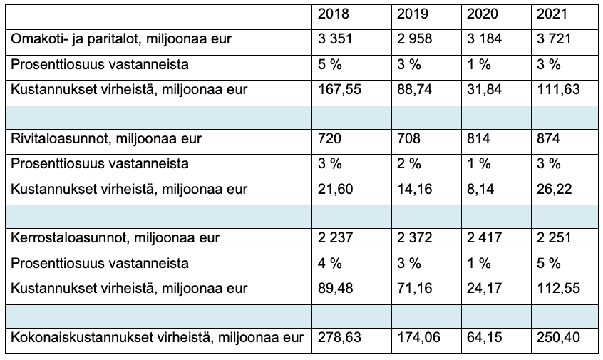 Taulukossa on esitetty virheiden korjauskustannukset vuosina 2018–2021. Vuonna 2021 omakoti- ja paritalojen sekä rivitaloasuntojen virheiden korjauskustannukset olivat noin 3 % korjauskustannuksista, kun taas kerrostaloasuntojen virheiden korjauskustannusten osuus samana vuonna oli noin 5 %. Kokonaisuudessaan vuonna 2021 virheiden korjauskustannukset ovat huikeat yli 250 miljoonaa euroa. Tilastokeskus on poistanut virheiden korjauskustannusten tilastoista ne kustannukset, joiden käsittely on päättynyt siviilioikeusprosessiin. Näitä tai niiden riita-asioita koskevia kustannustietoja ei ole Tilastokeskukselta saatavissa. (Tilastokeskus 2022.)